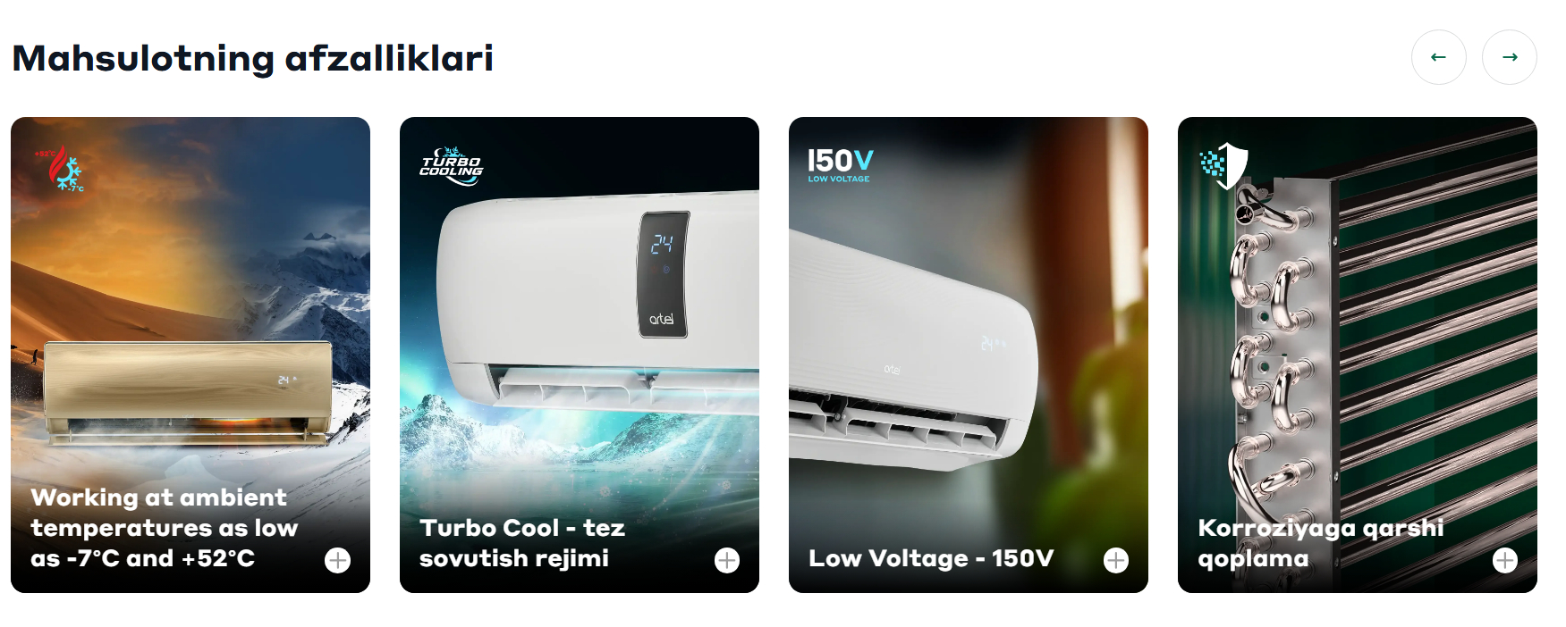 Konditsioner mamlakatimiz iqlim sharoitiga to‘liq moslashtirilgan. Elektr bilan bog'liq muammolar bo'lsa, u Turbo High Performance rejimida ishlashi mumkin, u avtomatik ravishda yoqiladi va avval o'rnatilgan rejimni qayta sozlaydi.