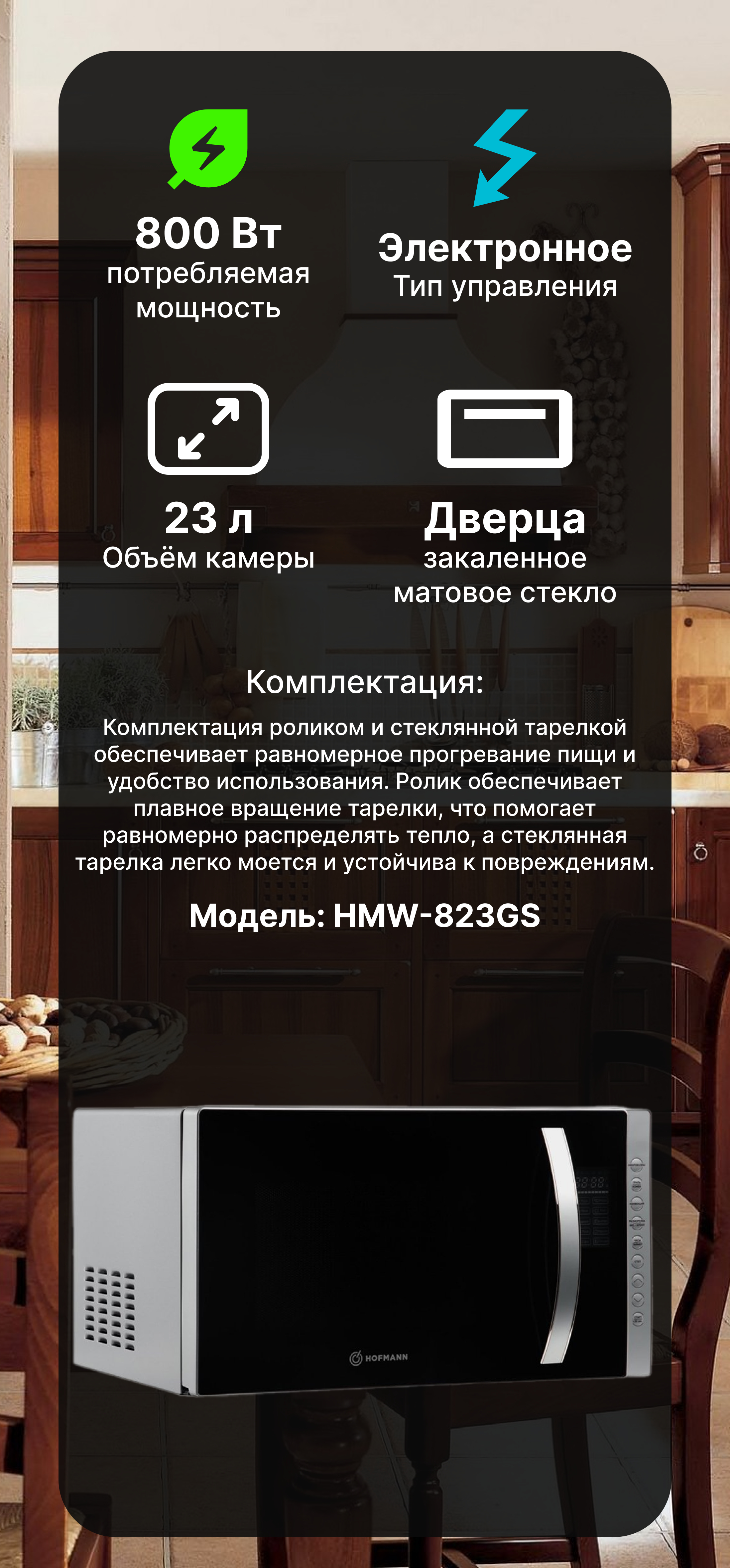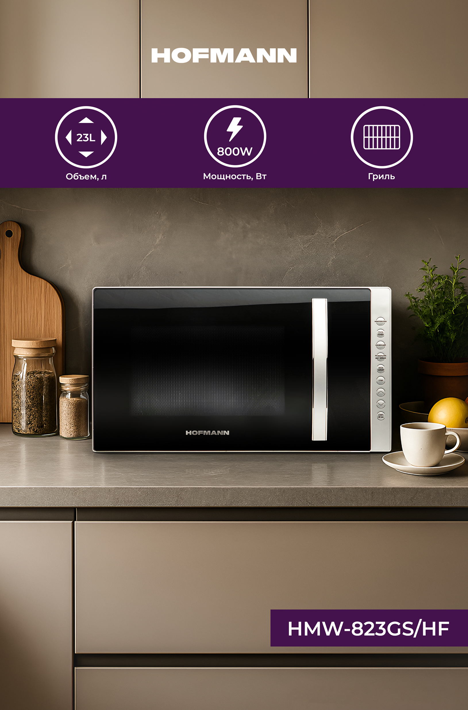 Dizayn: Hofmann HMW-823GS turli xil oshxona interyerlariga mos keladigan zamonaviy va zamonaviy dizaynga ega.