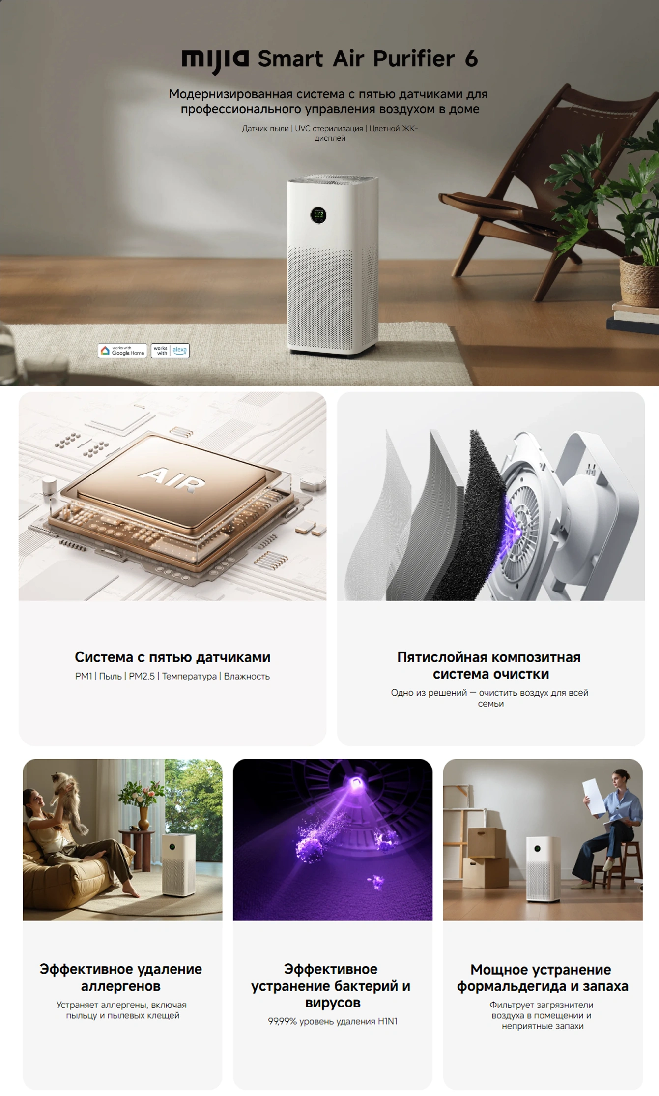 Aqlli havo tozalagich Mijia 6 — uy sharoitida havo sifatini professional darajada nazorat qilish uchun mo‘ljallangan zamonaviy qurilma. U allergenlar, bakteriyalar, viruslar, formaldegid va yoqimsiz hidlarni samarali yo‘q qilib, butun oila uchun sog‘lom va xavfsiz muhit yaratadi.