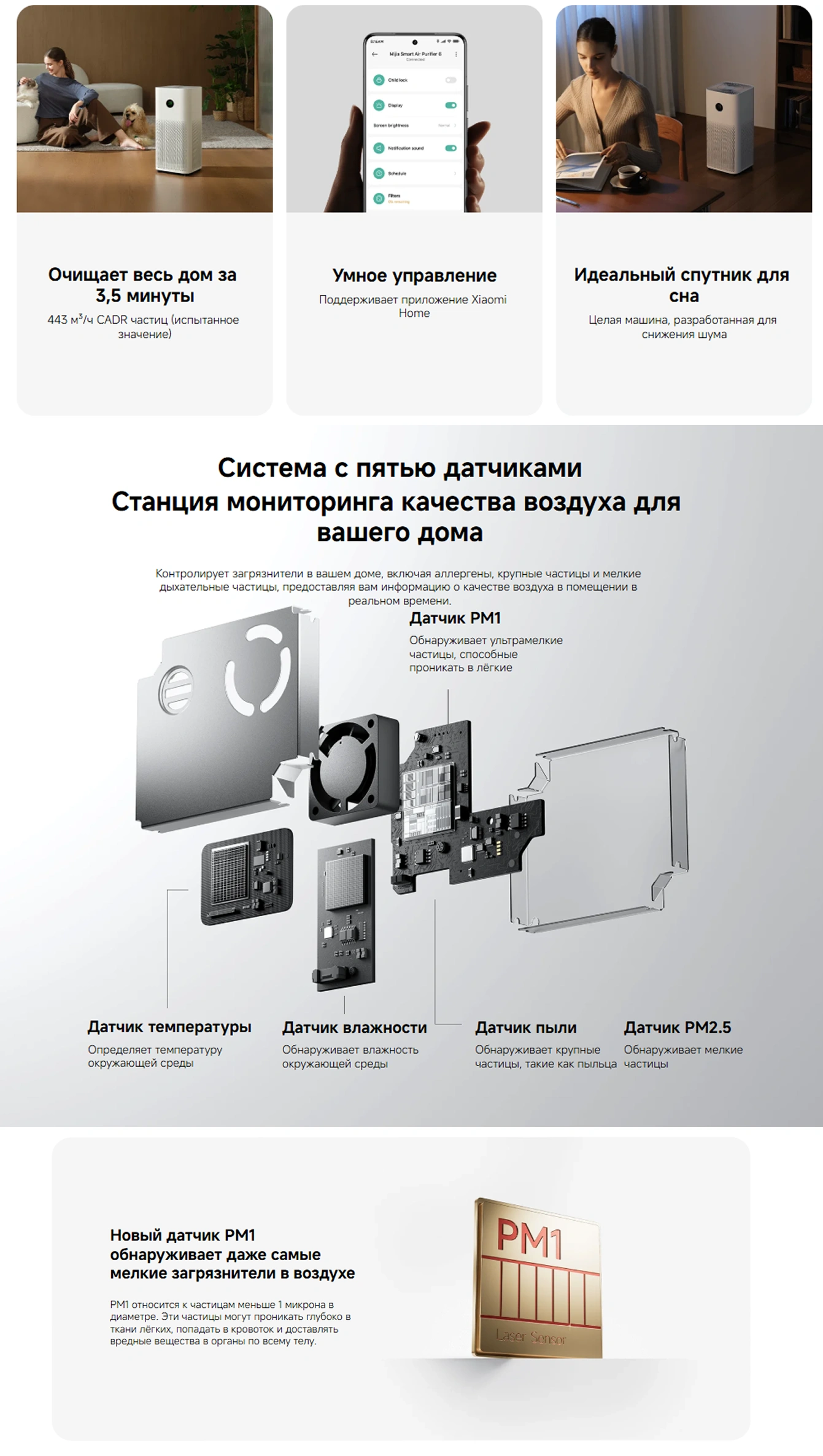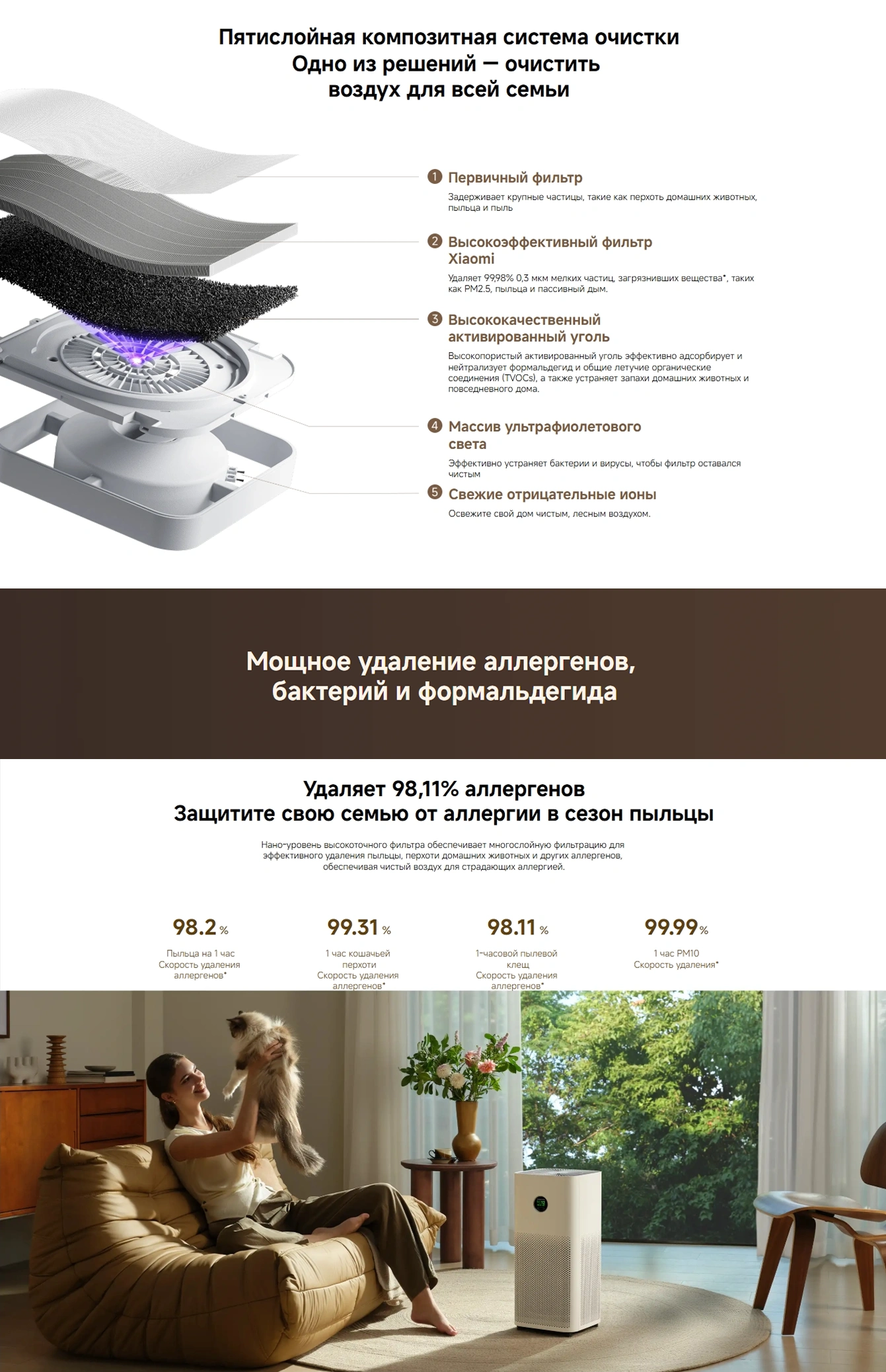 Xiaomi yuqori samarali filtri 0,3 mkm o‘lchamdagi zarrachalarning 99,98% ini, jumladan PM2.5 va tutunni olib tashlaydi.