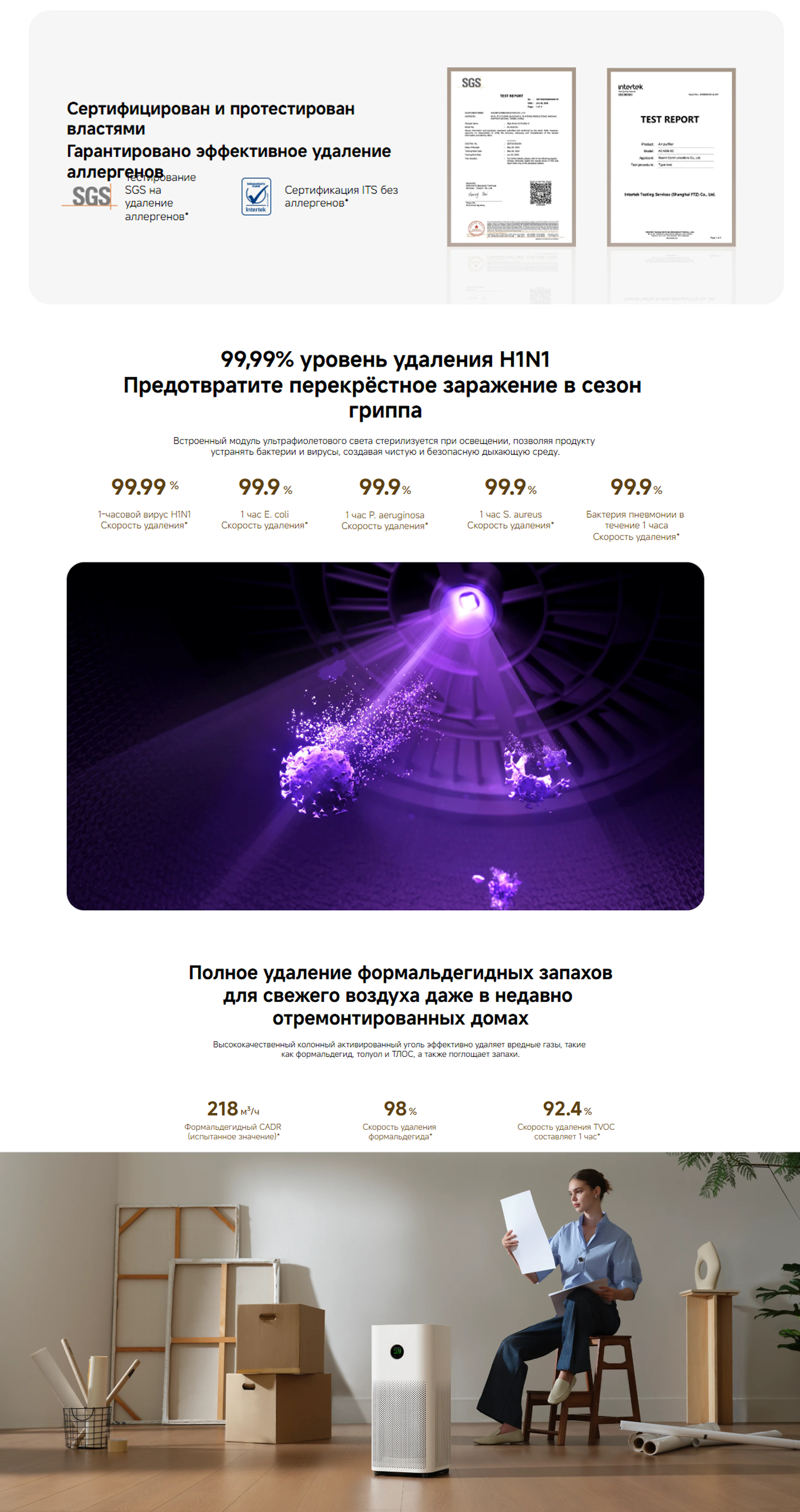 Formaldegid va zararli gazlarni yo‘q qilishda qurilma 218 m³/soat CADR ko‘rsatkichiga ega. 1 soat ichida formaldegidning 98% va TVOCning 92,4% gacha qismini olib tashlaydi. Bu yangi ta’mirlangan uylar uchun ayniqsa muhim, chunki formaldegid mebel, bo‘yoq, gilam va matraslardan ajralib chiqadi.