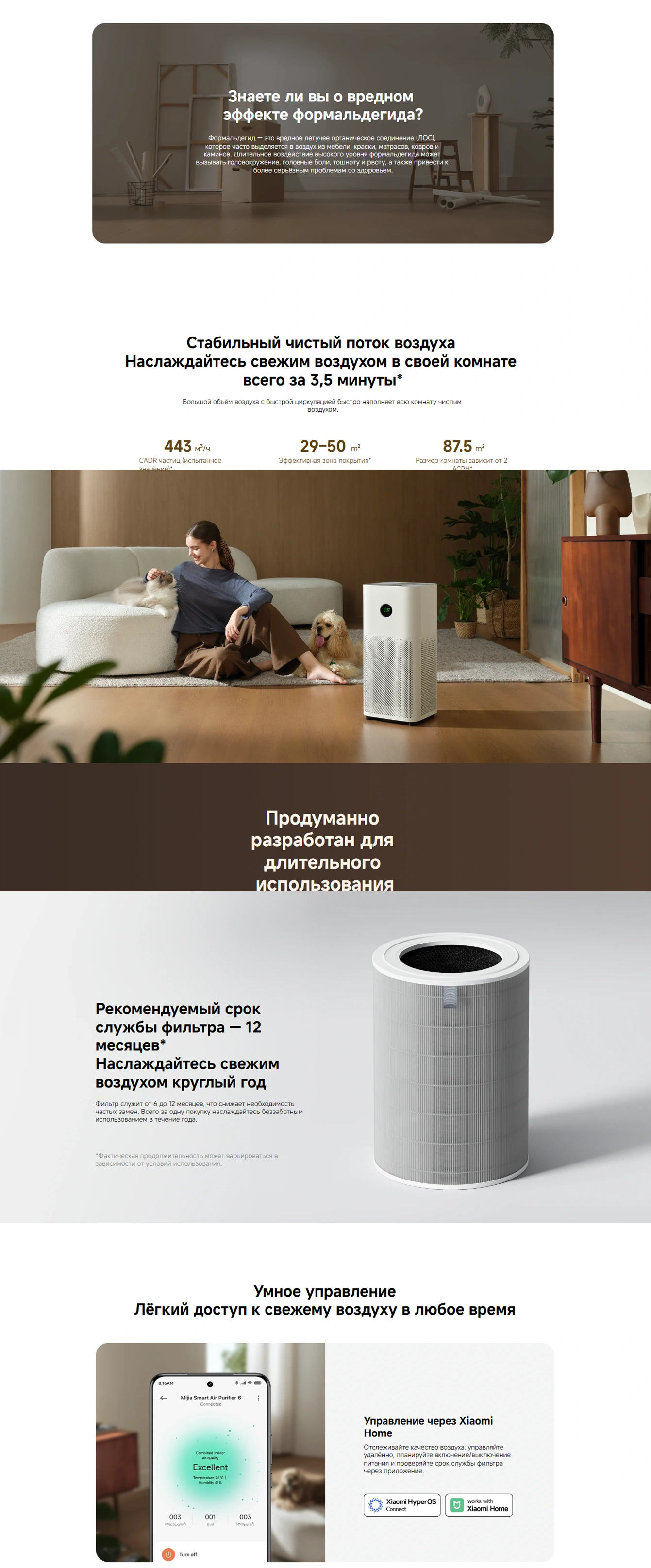 Minimalistik dizayn va olinadigan yuqori qopqoq ichki havo kanallari va ventilyatorni tozalashni osonlashtiradi. Mijia 6 funksionallik, xavfsizlik va estetikani birlashtirgan ishonchli havo tozalagichdir.
