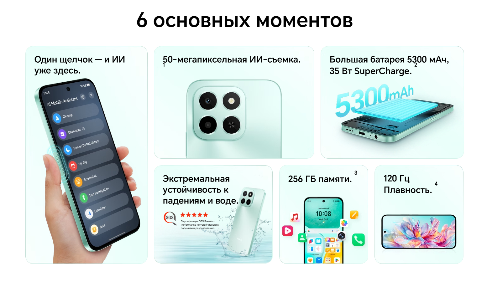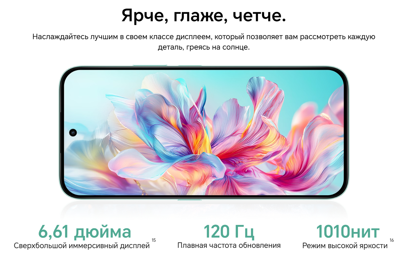 HONOR X6c — bu zamonaviy dizayn, kuchli xususiyatlar va ilg‘or texnologiyalarni o‘zida mujassam etgan zamonaviy va samarali smartfon. Uchta nafis rangda taqdim etiladi: Okean sian, Yarim tun qora va Oy nuri oq (bozorga qarab farq qilishi mumkin). Ushbu qurilma kundalik foydalanish uchun ideal bo‘lib, yuqori unumdorlik, kamera va ishonchli avtonomiyani taqdim etadi.