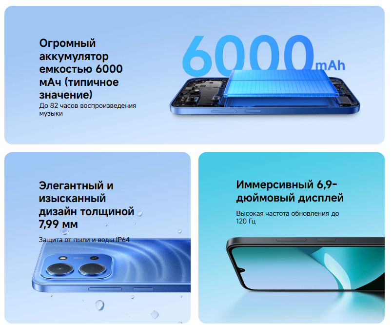 - 📺 6,9″ IPS HD+ katta ekran, 120 Gts yangilanish chastotasi, Corning Glass 3 himoyasi.