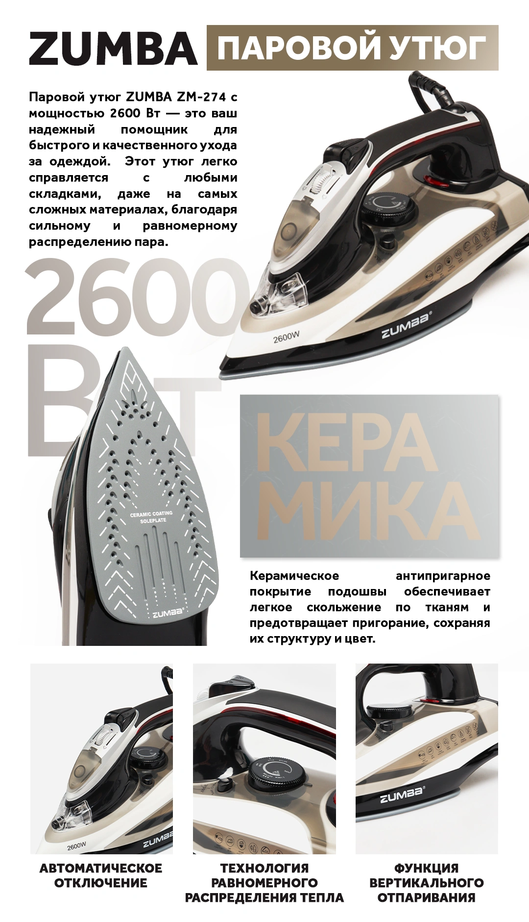 ZUMBA ZM-274 — это мощный и функциональный паровой утюг, который обеспечит вам качественное и безопасное глаженье без лишних усилий!